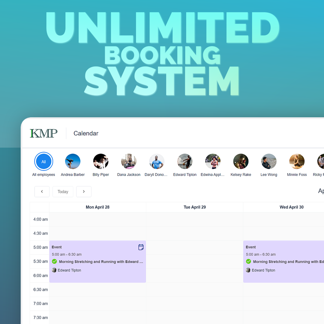 Example: KMP All-In-One Booking System – Employees. Services. Appointments. Locations. Customers. All unlimited. No restrictions or extra cost to have more of everything.